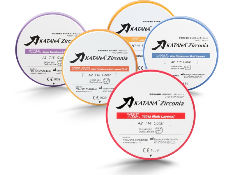 KATANA™ Zirconia – ein vielseitiges Sortiment an Hochleistungszirkonoxiden für monolithische und mehrschichtige Restaurationen. Die Materialien überzeugen durch natürliche Ästhetik, hohe Festigkeit, präzise Fräseigenschaften und effiziente Sinterprozesse, die schnelle und qualitativ hochwertige Ergebnisse ermöglichen.